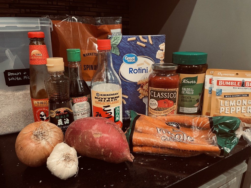 Keep in mind my go to dishes are Asian, Mexican, Italian, and sometime Mediterranean. It’ll look different for anyone. These are my go to ingredients that I must restock on if running low. This eases my mind so I don’t have to think twice about what I need and it’s flexible enough that I can make a wide variety of dishes with these limited ingredients.